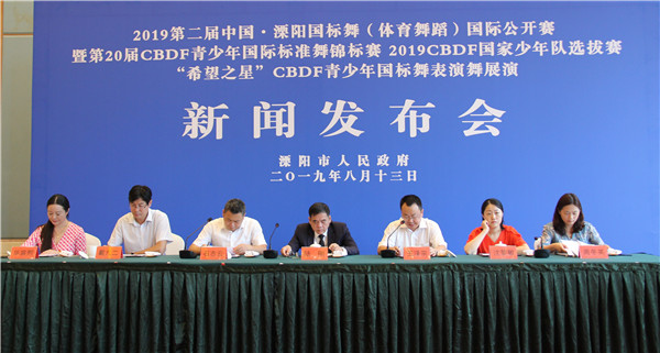 发布时间:2019年8月13日上午10:00 发布地点:天目湖豪生大酒店溧阳B厅 发布主题:2019第二届中国·溧阳国标舞(体育舞蹈)国际公开赛暨第20届CBDF青少年国标舞锦标赛新闻发布会 发布人员:陆 刚 中国国际标准舞总会秘书长助理、办公室主任 王泽宗 溧阳市人民政府副市长 沈黎敏 溧阳市委宣传部副部长 戴九二 溧阳市文体广电和旅游局副局长