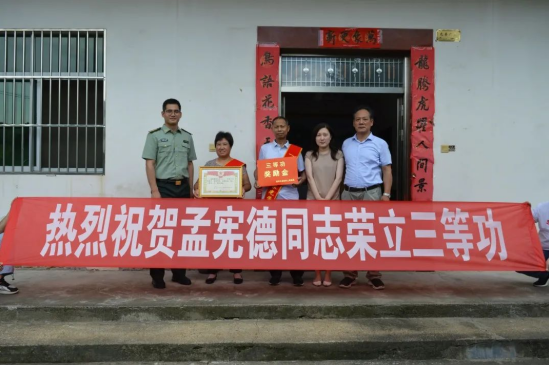 青春激扬建功在军营,立功获奖喜报传家乡。7月6日,溧阳市退役军人事务局、戴埠镇人武部、戴埠镇退役军人服务站一行,一路敲锣打鼓来到立功现役军人孟宪德家中,送上立功喜报、“三等功臣之家”牌匾以及奖励金。