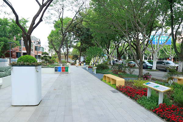 叶语园位于溧阳市文化小学南门西侧,总面积约为1800平方米。项目践行“乐享园林”理念,从老百姓生活需求出发,梳理原有绿地、打开活力空间,打造高品质乐享场景。改造时考虑到旁边小学,设置“有温度的等待区”,为家长上下学接送营造休憩空间。项目突出“自然、芳香”,打造以植物为主题的芳香花园,搭配四季植物花境营造四季花园,通过“看、摸、闻、识”的沉浸式感官体验,增强小朋友对自然物种的了解,增加林荫下的休憩与活动场所,既解决了周边户外活动场地欠缺的难题,又提升了地块“颜值”, 让“乐享场景”触手可及。
