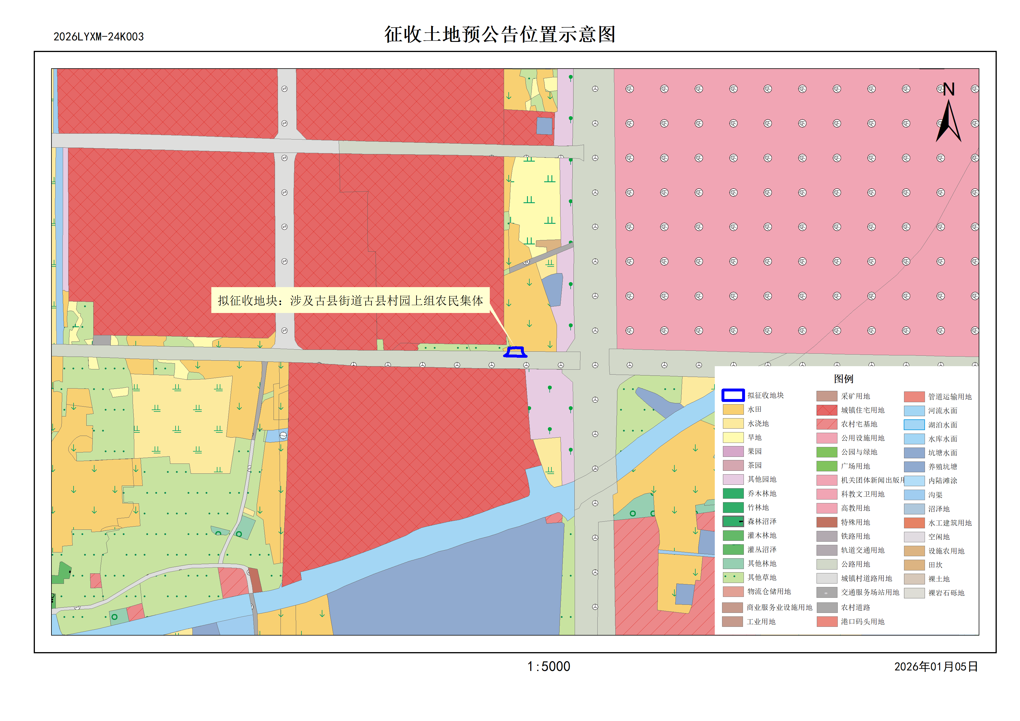 本次拟征收土地2026LYXM-24K003位于古县街道古县村园上组范围内。拟征收集体土地面积0.0270公顷(0.4050亩),位置详见附图。