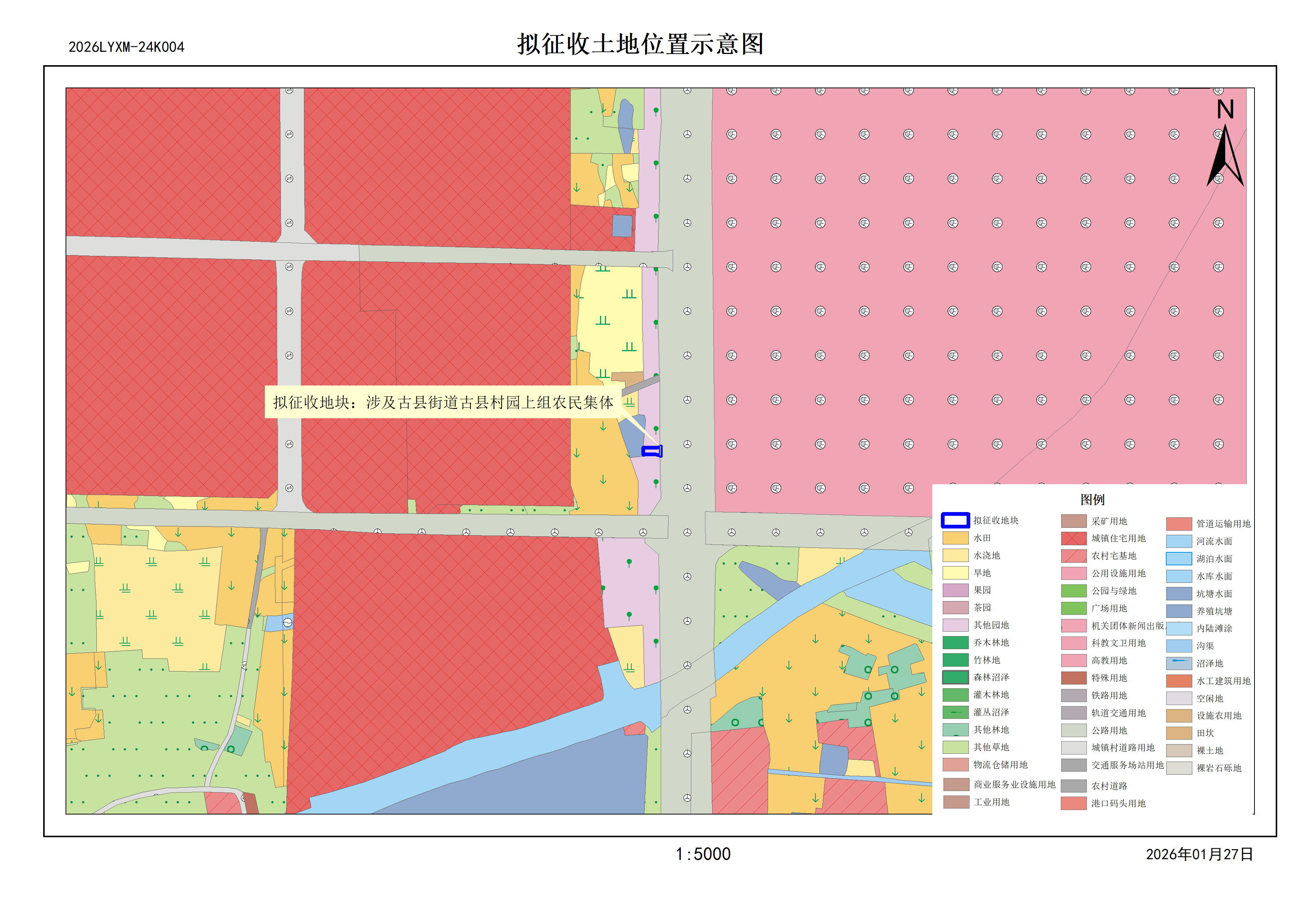 本次拟征收土地2026LYXM-24K004位于古县街道古县村园上组范围内。拟征收土地位置详见附图。