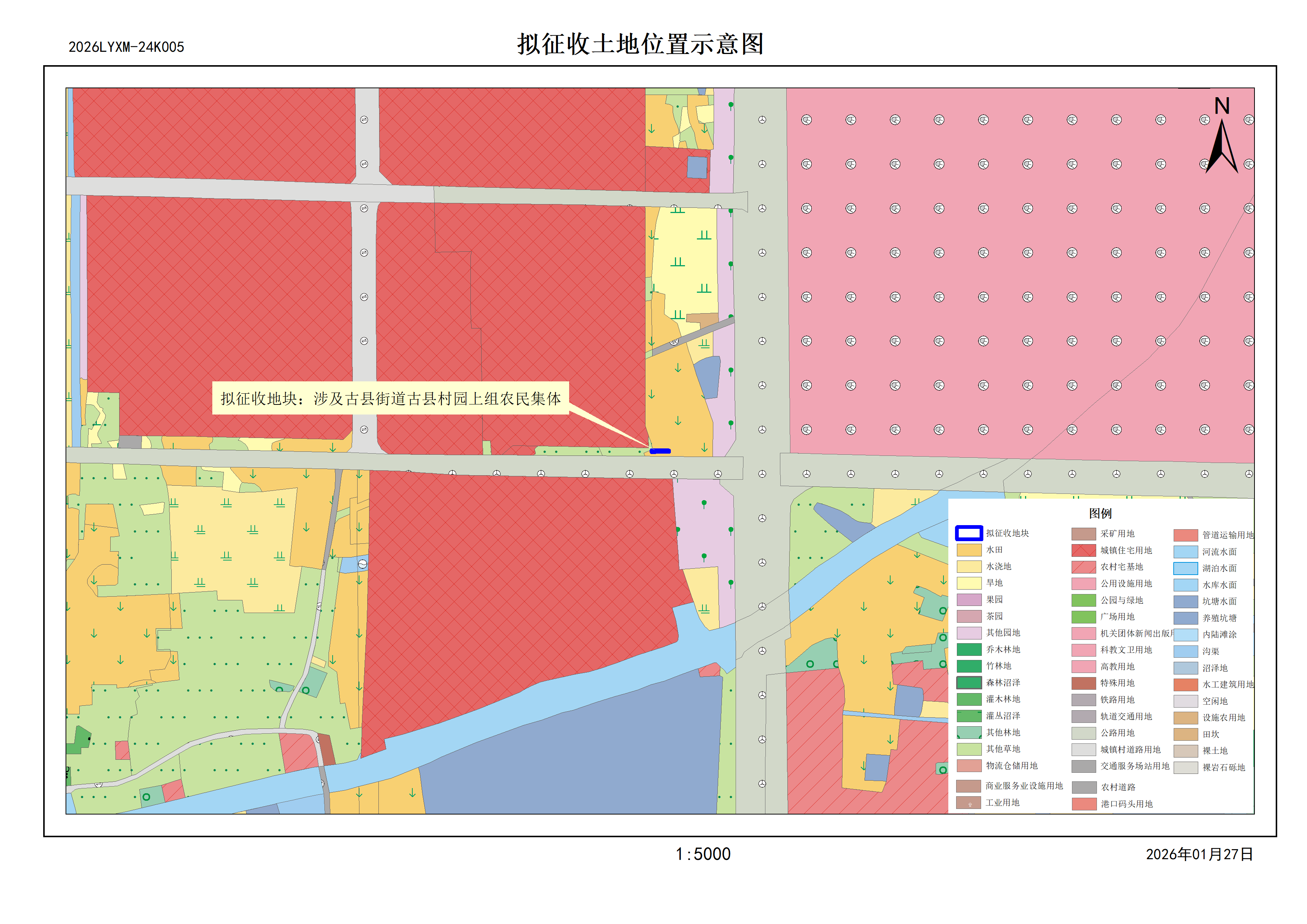 本次拟征收土地2026LYXM-24K005位于古县街道古县村园上组范围内。拟征收土地位置详见附图。