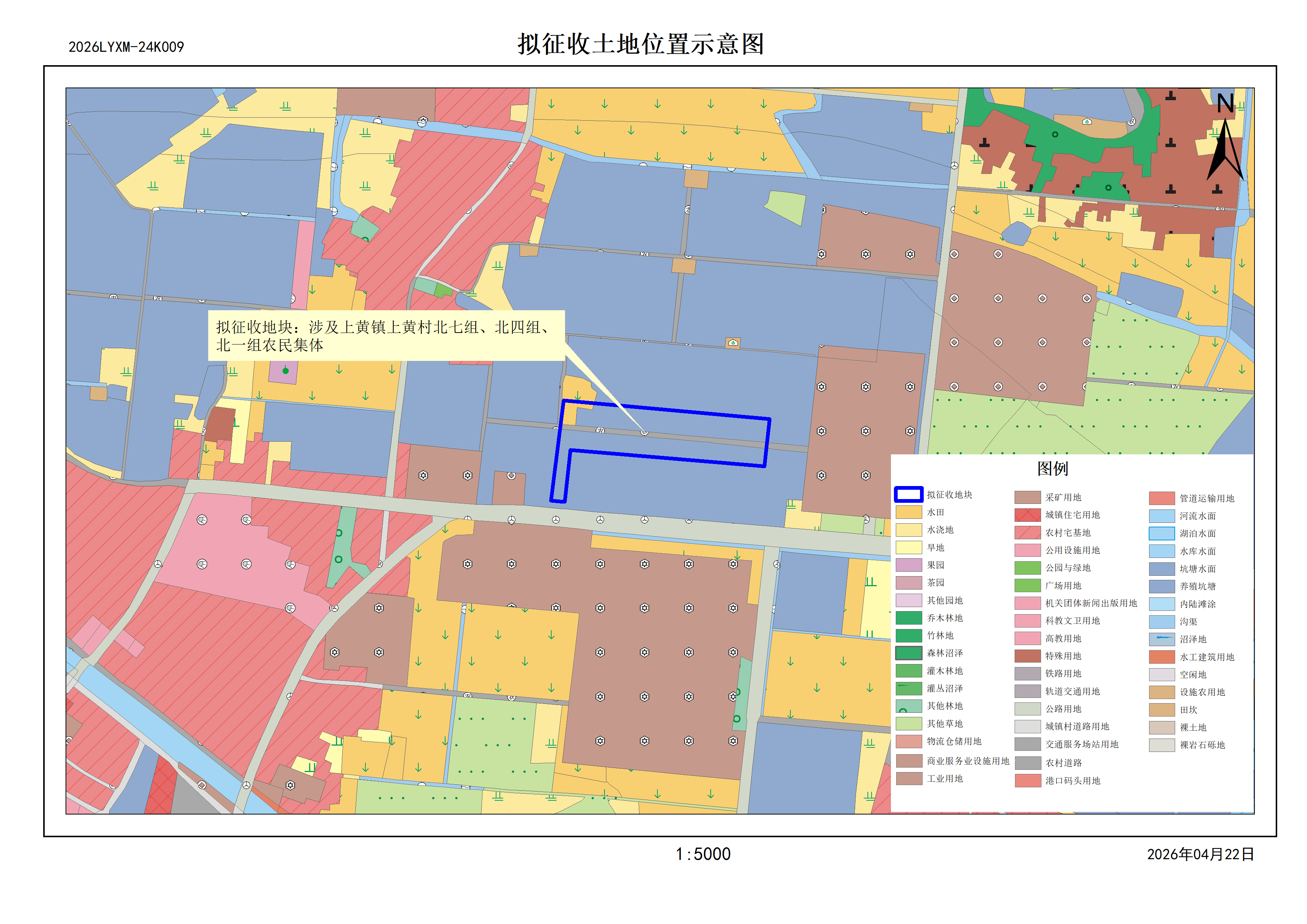 本次拟征收土地2026LYXM-24K009位于上黄镇上黄村北七组、北四组,北一组范围内。拟征收土地位置详见附图。